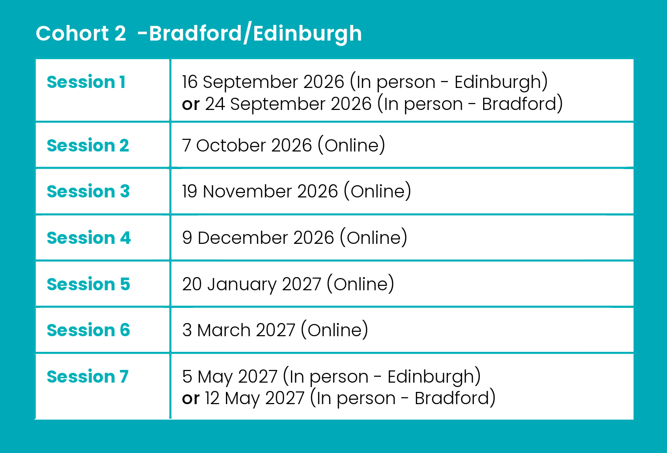 The 2026/2027 Coaching Academy programme has two cohorts running for either 9 or 6 months. They consist of two full in-person training days - one at the beginning and one at the end - plus five remote online sessions. Locations for in-person training include London for Cohort 1, and options of Bradford and Edinburgh for Cohort 2, with specific dates outlined for each cohort below. The remainder of the sessions are delivered online, allowing for flexibility and accessibility.